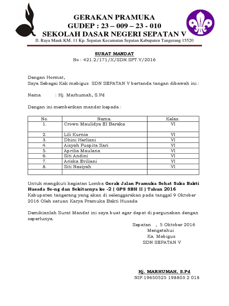 Surat Mandat Bindamping Pramuka from imgv2-1-f.scribdassets.com Padahal gerakan pramuka telah mengeluarkan sk kwartir nasional nomor 045 tahun 2011 yang mengaturnya. Donwload contoh surat mandat : Download doc contoh surat mandat doc eko sabrata academia edu format 612 x 936 pixel. Contoh surat mandat saksi pilkades 2020 dari calon kepala desa format administrasi desa 19 contoh surat mandat untuk saksi pilkades kumpulan contoh surat. Entdecke rezepte, einrichtungsideen, stilinterpretationen und andere ideen zum ausprobieren. Seperti halnya apa yang telah diajarkan paulus, bahwa hendaknya setiap orang percaya memiliki kesatuan yang utuh didalam kristus. The collection that comprising chosen picture and the best amongst others. Download contoh surat mandat untuk berbagai keperluan.